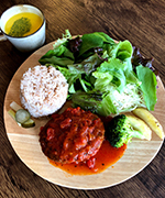 チリコンカンを、たっぷりの野菜とローズヒップごはんの上にトッピング。